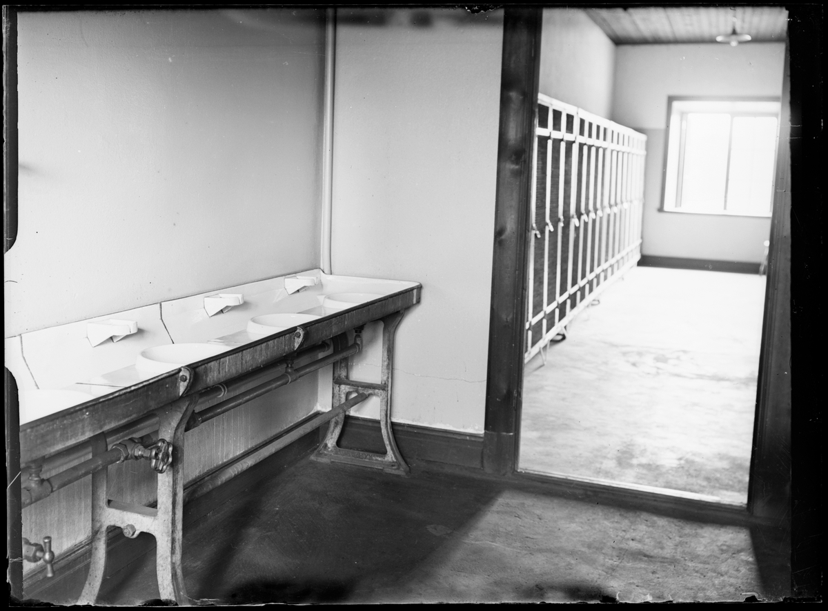 Titel: Interiör överliggningshus. Handfat och förvaringsskåp.