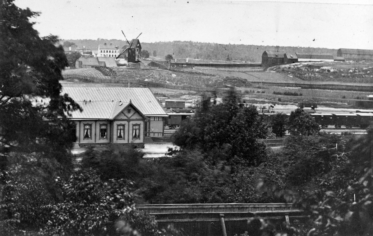 Utsikt över stationen. Kvarnen Fatburan i bakgrunden.