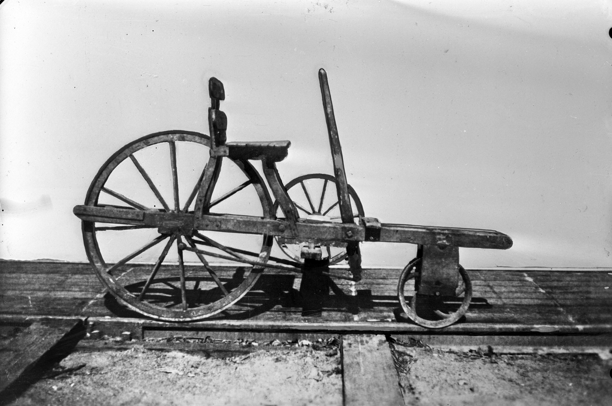 Dressin med dragstång; Järnvägsmuseet, Tillverkad av banvakt Anders Petter Larsson, Lagmanstorp på 1860-talet. Till Järnvägsmuseet 1944-06-01