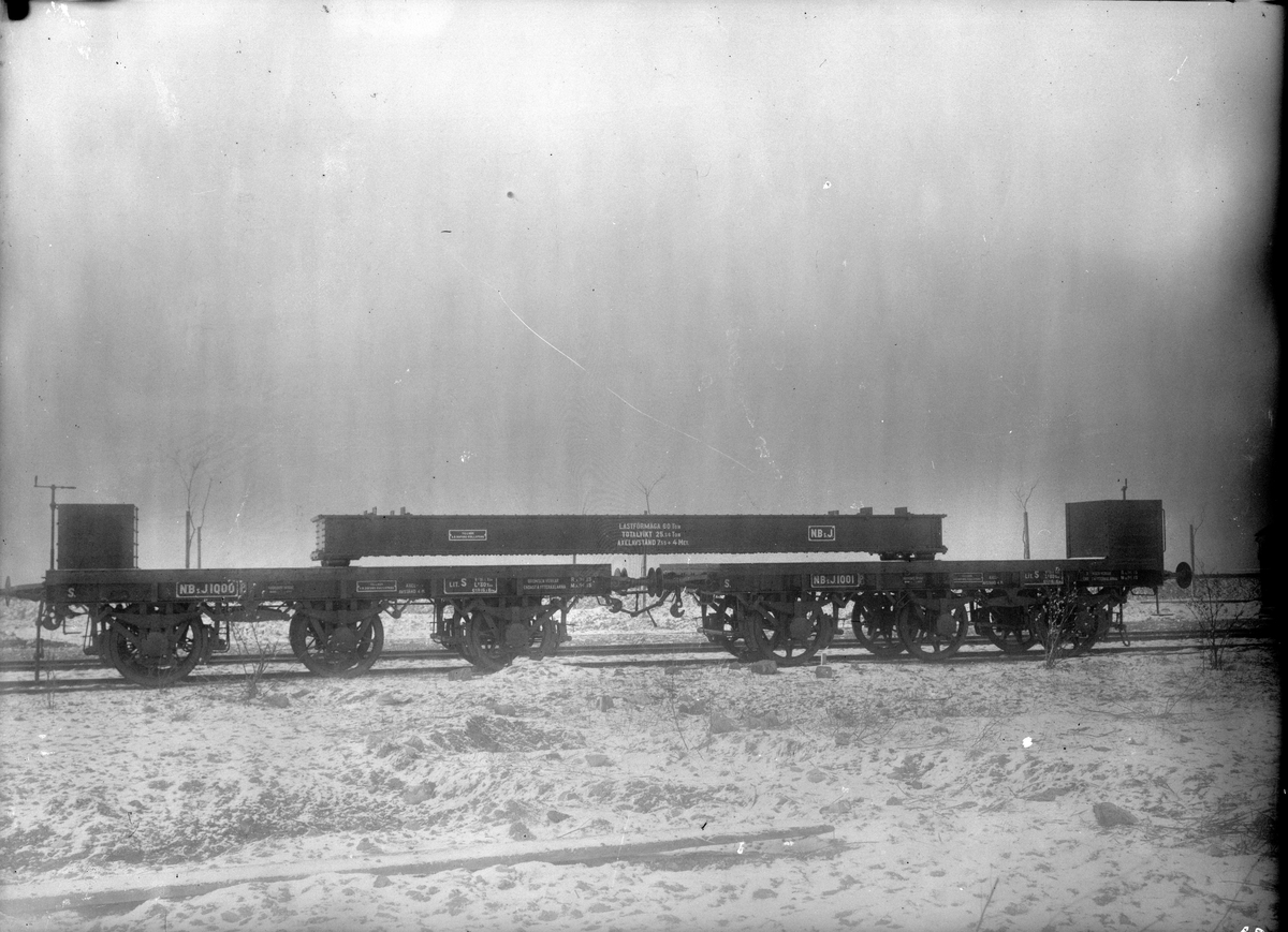 Nora - Bergslags Järnväg, NBsJ S 1000 och 1001. Kanonvagn med brygga för kanon. Kockums Mekaniska Verkstads AB