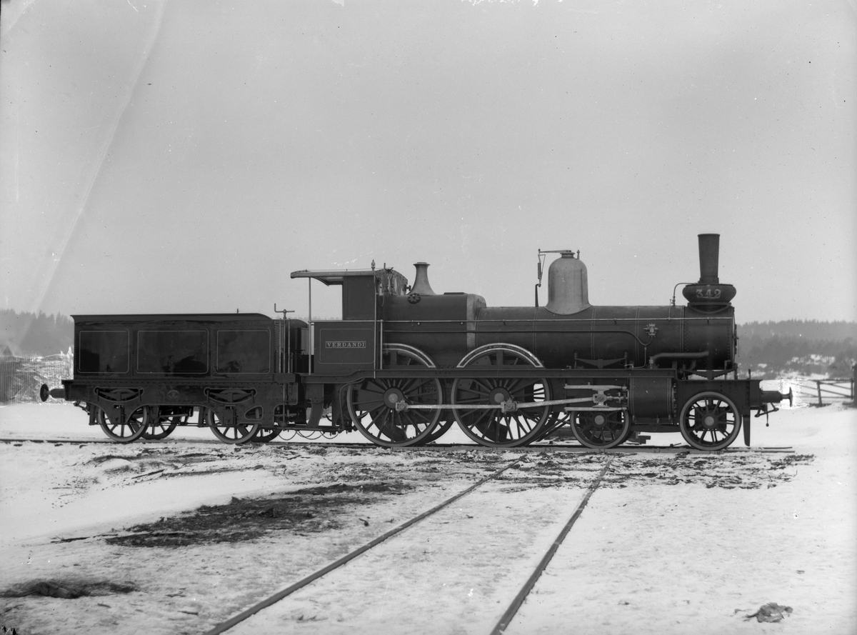 Statens Järnvägar, SJ Cb 342. Fick namnet Verdandi. Loket tillverkades av Nohab och hade högsta hastighet 90 km i timme. Cb loken levererades med tvåaxliga tendrar typ DK, som senare ersattes med treaxliga C-tendrar. Lokens ångpannans kapacitet räckte inte till. Verdandi ormbyggdes några gånger under sin aktiv tid: 1905 till SJ Cc 342, 1920 till SJ Cd 342. Under ombuggnaden förseddes det med överhettning. Verdandi som ses här vid reverensen 1886 var det sista SJ-loket som fick namn. Bilden är troligen tagen vid leveransen.