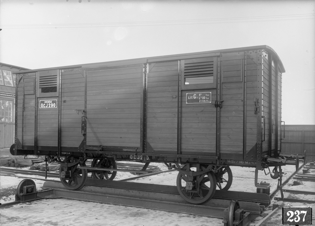 Östra Centralbanan, ÖCJ G1 290. Vagnen står på en marktravers.