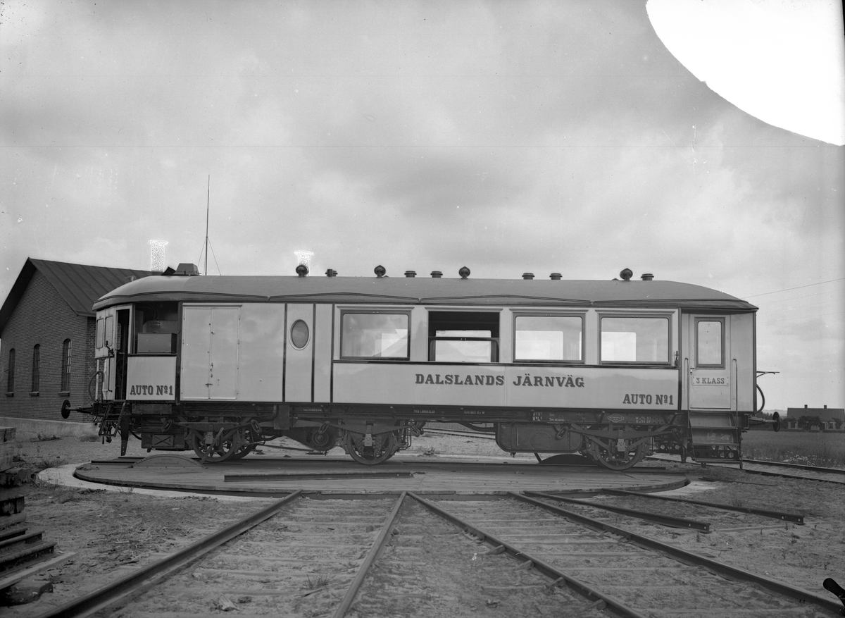 DJ Ångvagn Auto 1. Leveransfoto. Ångvagnen på vändskiva. Vagnen tillverkades av Mekaniska Verkstad och Waggonfabrik i Arlöv. En länkaxelvagn. Slopades och skrotades 1937.