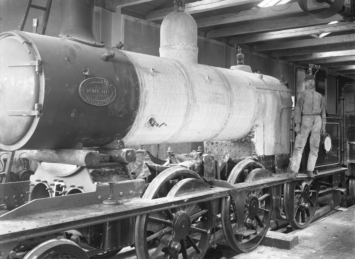 BHJ lok 1. Bilden är tagen vid revision troligen i Trollhättan. Loket tillverkades 1898 av Nohab. Skrotades 1939.