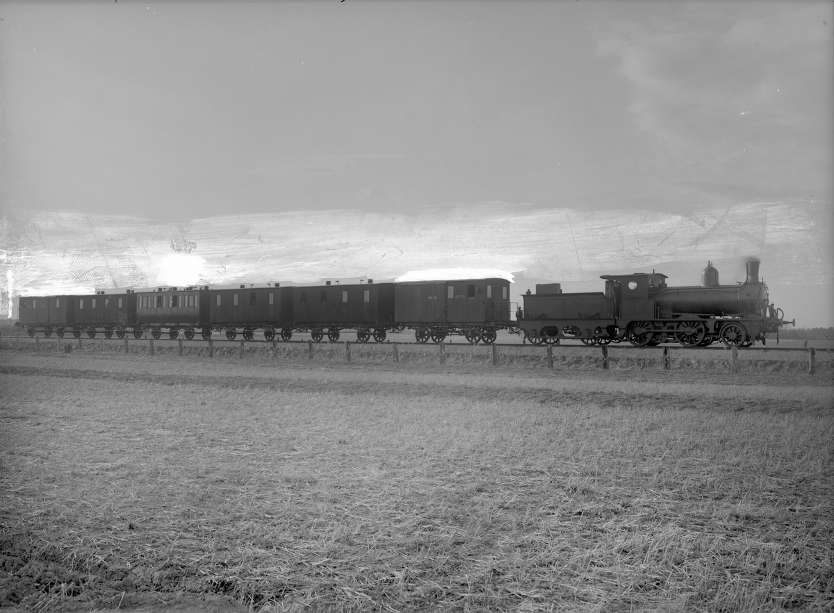 Titel: SWB A2 6. Ånglok med gammalt tågsätt. Loket tillverkades 1874 och skrotades 1927.