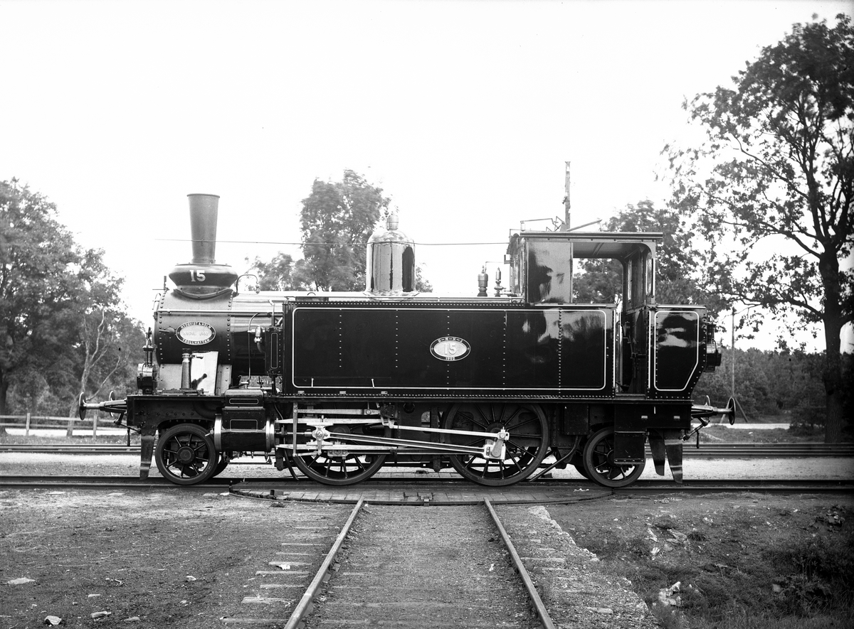 UWHJ lok 15. Leveransfoto. Ånglok på vändskiva. Loket tillverkades av Nohab och hade högsta hastighet 60 km i timme. Såldes 1940 till Statens Järnvägar och fick littera SJ Å 1626. Skrotad 1955.