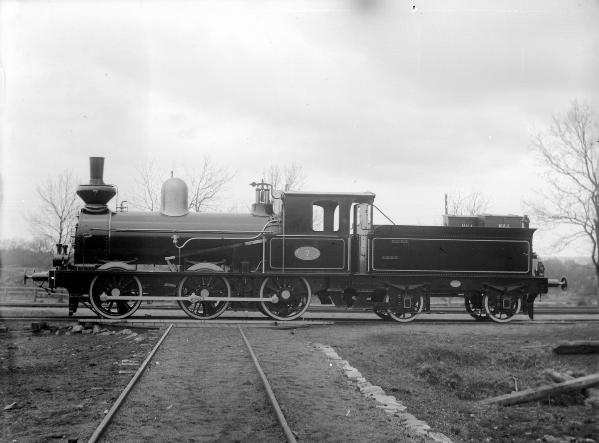 MWJ lok 7. Leveransfoto. Ånglok på vändskiva. Loket tillverkades av Nohab och hade högsta hastighet 60 km i timme. Såldes 1917 till Sveriges Järnvägar, fick littera SJ MVa 1352. Skrotades 1956.