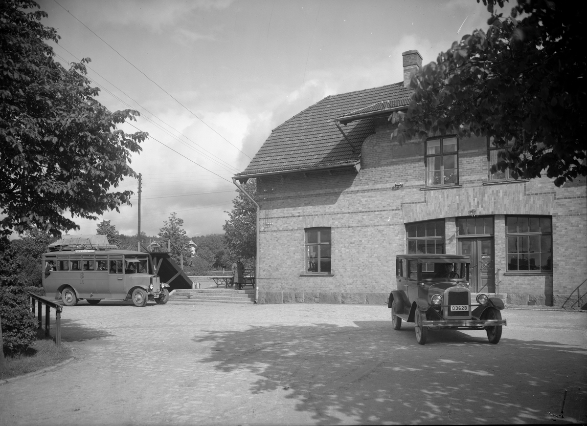 Statens Järnvägar, SJ buss 10. Framsidan av station, som byggdes 1905 i två våningar i sten, renoverad på 1930-talet