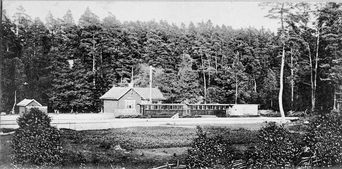 Stationen med envånings stationshus i trä, före ombyggnad, med en gavel mot banan