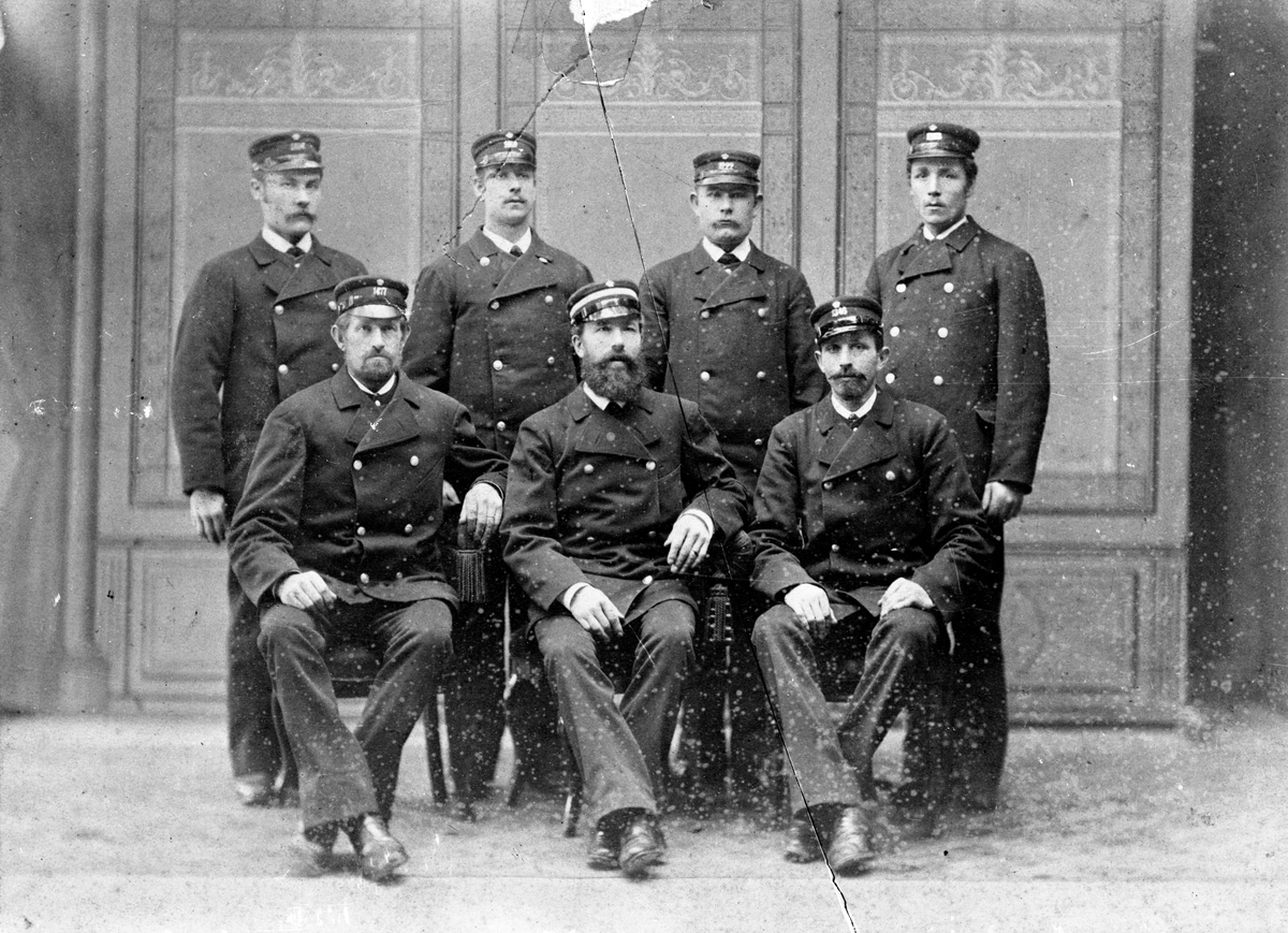 Stationspersonal. Stationskarl Lööf, Stationskarl Nilsson, Stationskarl Hedman, Stationskarl Springare, Stationskarl Forsberg, Stationskarlförman Österlund,