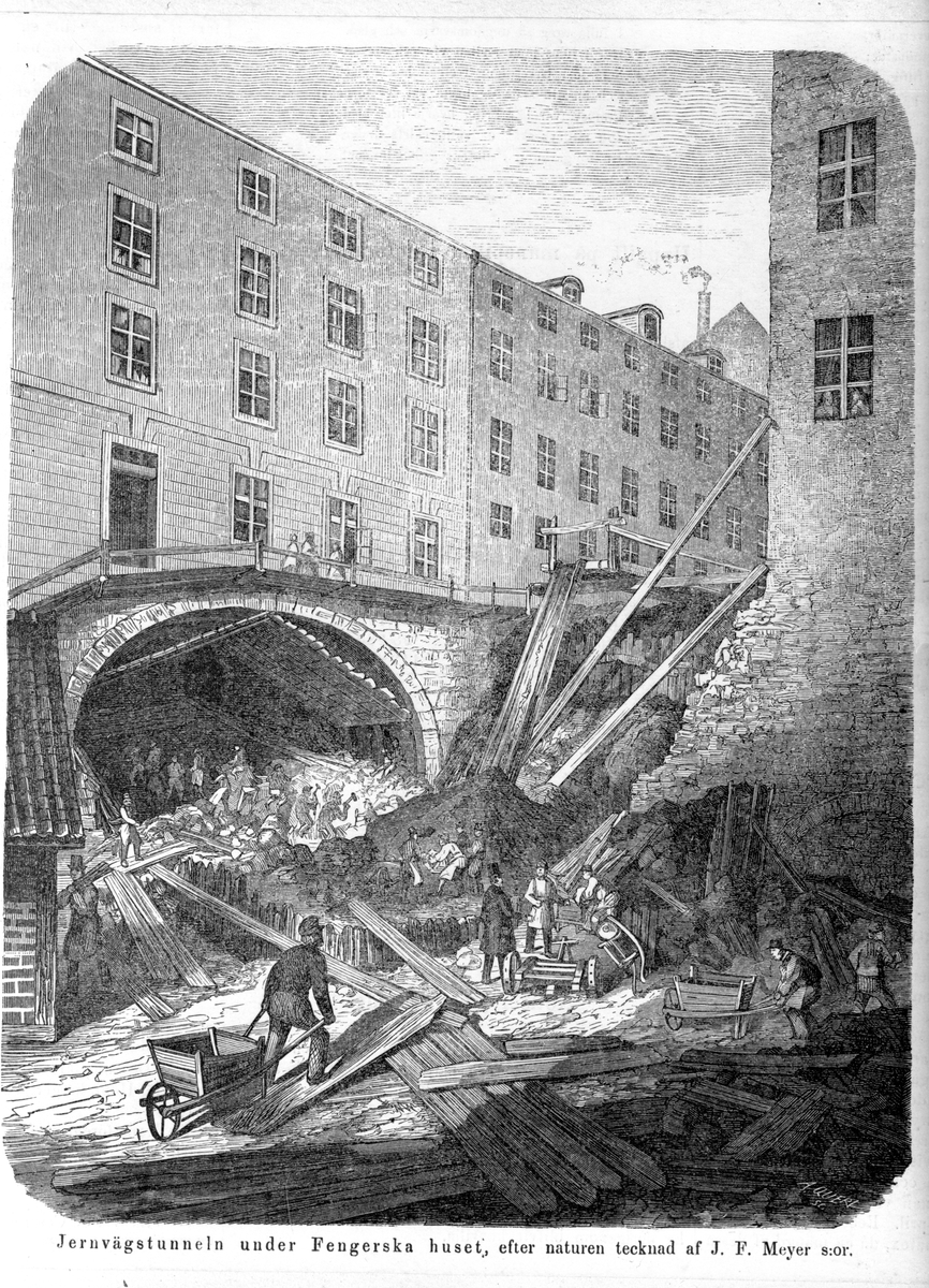 Illustration av bygge av järnvägstunnel under Fengerska huset. 1860-talet.