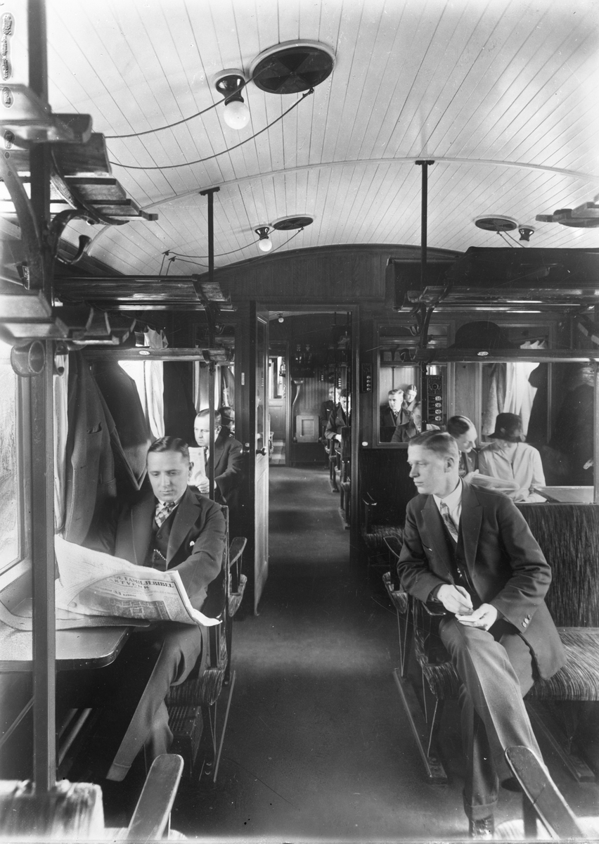 Statens Järnvägar andra klass salongsvagn, SJ C08. Antingen SJ Co8 2705 eller SJ Co8 2773 vilka levererades med elbelysning.
