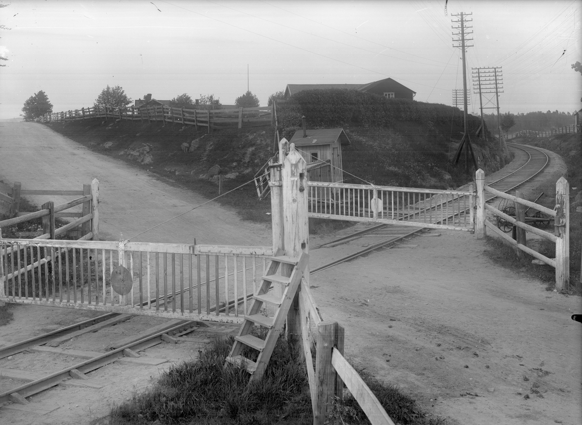 Linjen Hudiksvall - Forsa, vid Vi. Vägövergång med grindar för spåret.