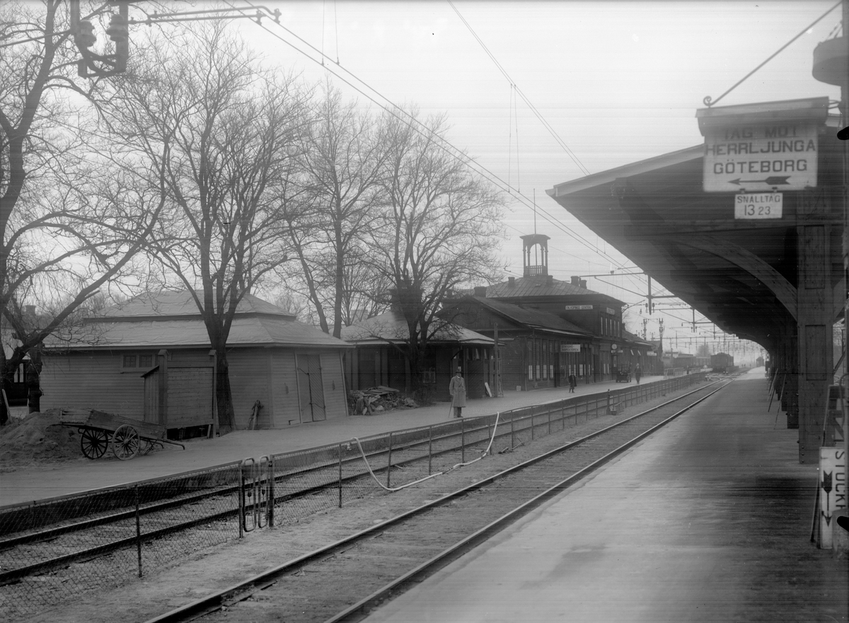 Gamla stationshuset taget från norr. Byggd 1857-58. Tåg mot Herrljunga - Göteborg