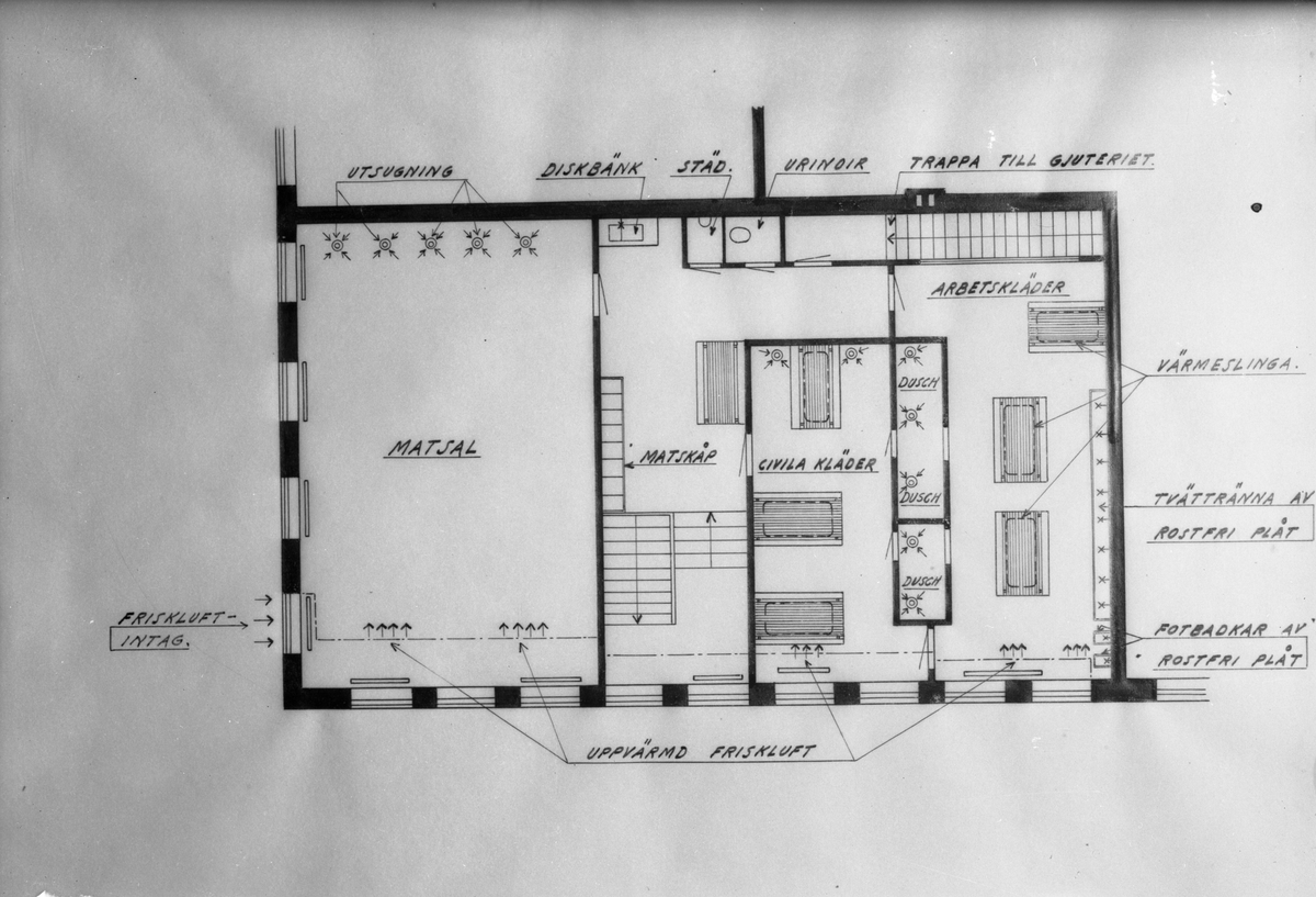 Ritning över plan av matsal och klädrum i nya gjuteriet
