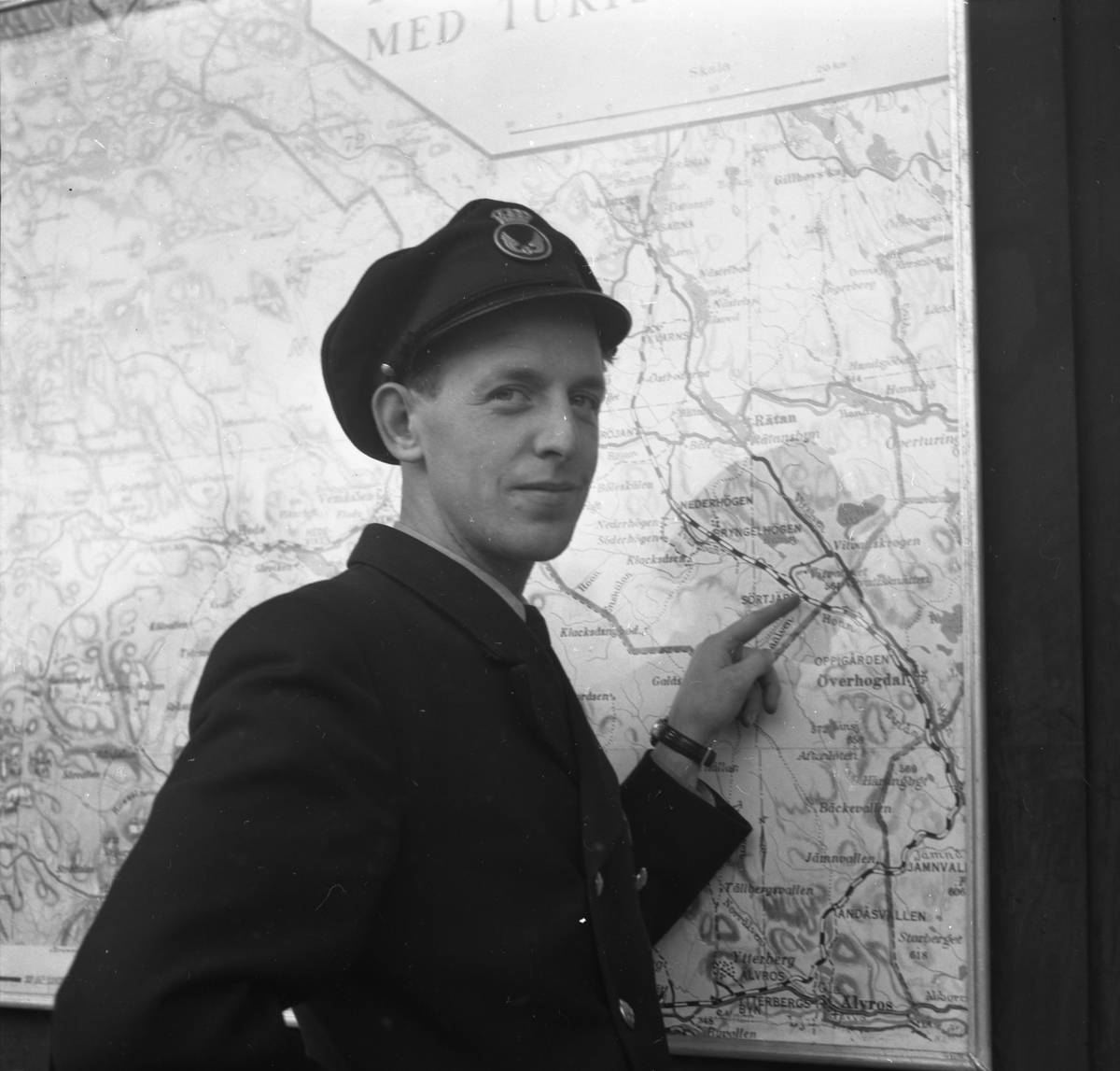 Sveriges Järnvägsfamilj Nr 1. Korad i SJ-NYTT nr 11-12 År:1956. Stationskarl Ragnvald Johansson pekar ut platsen Sörtjärn, som familjen bott större delen av tiden vid banan