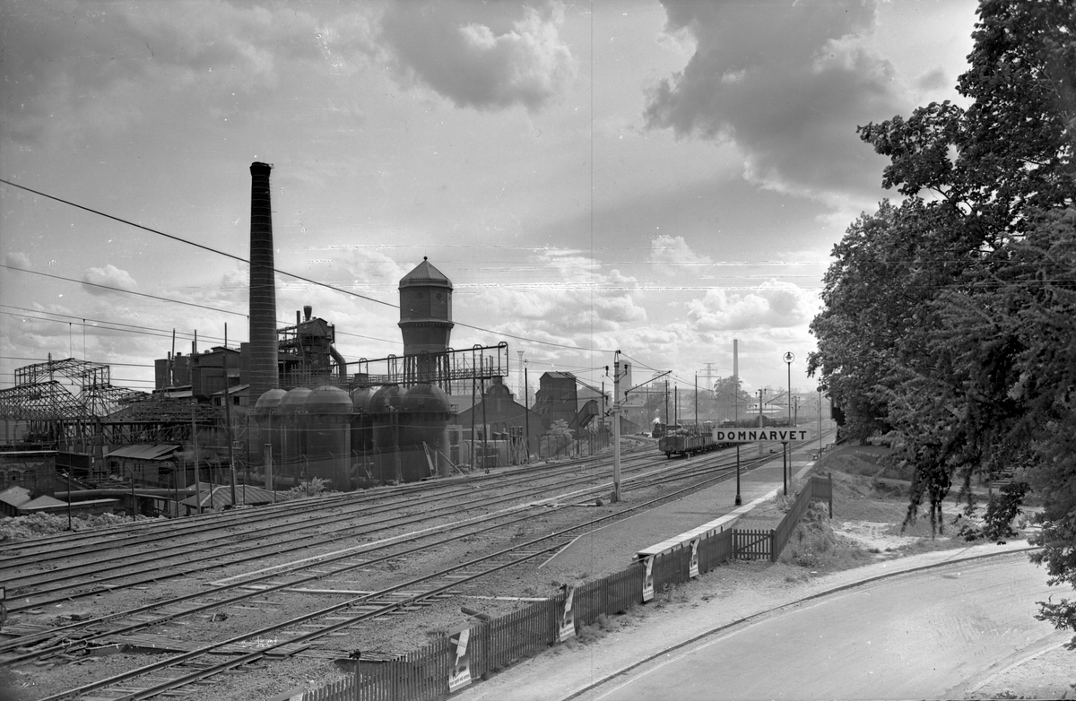 Bangården vid Domnarvet station. Järnverket i bakgrunden.