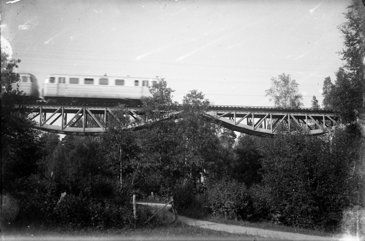 Nora - Bergslags Järnväg, NBJ, rälsbuss på bron.