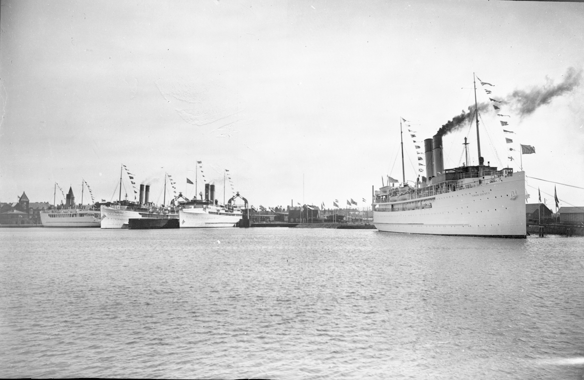 Tre svenska och en tysk färja vid Trelleborgs hamn.