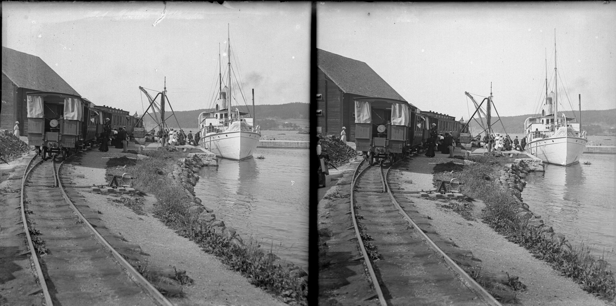 Mellersta Östergötlands Järnväg, MÖJ personvagn 53. Hamnen, bockkran. S/S trafik ligger vid kajen.
