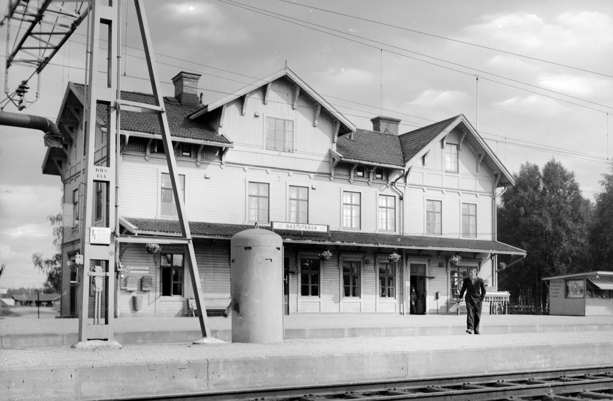 Bastuträsk station. Den runda behållaren på plattformen är en bevakningskur/splitterskydd. Byggd av tjock järnplåt, minst 1 cm.