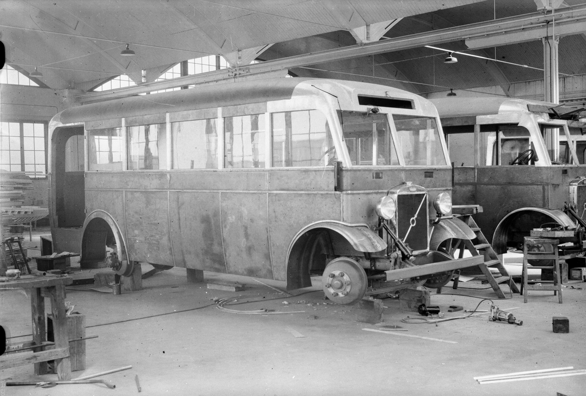 Busshallen. Karosstillverkning på Volvo-chassi. Aktiebolaget Svenska Järnvägsverkstäderna, ASJ.