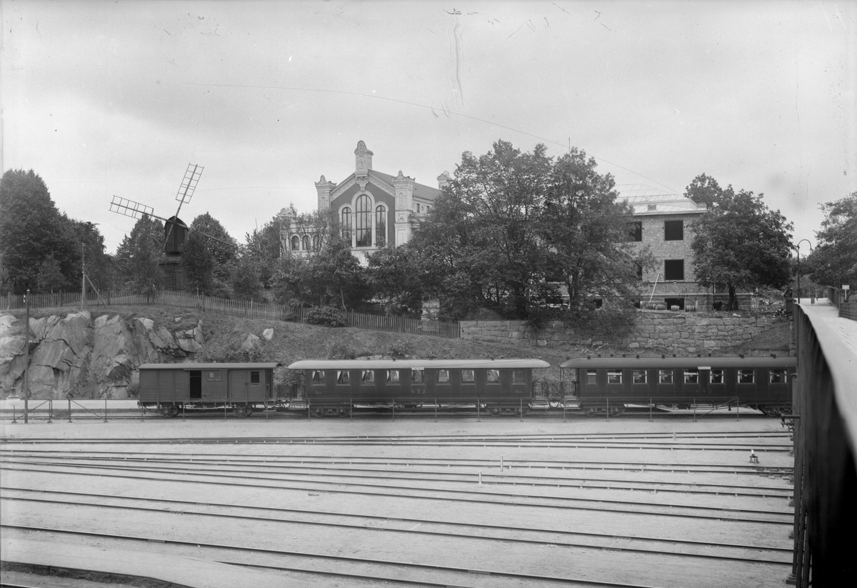 Godsvagn samt 3:e klass personvagnar från Växjö - Tingsryds Järnväg, VTJ. I bakgrunden Smålands Museum med tillbyggnad invigd 1930.