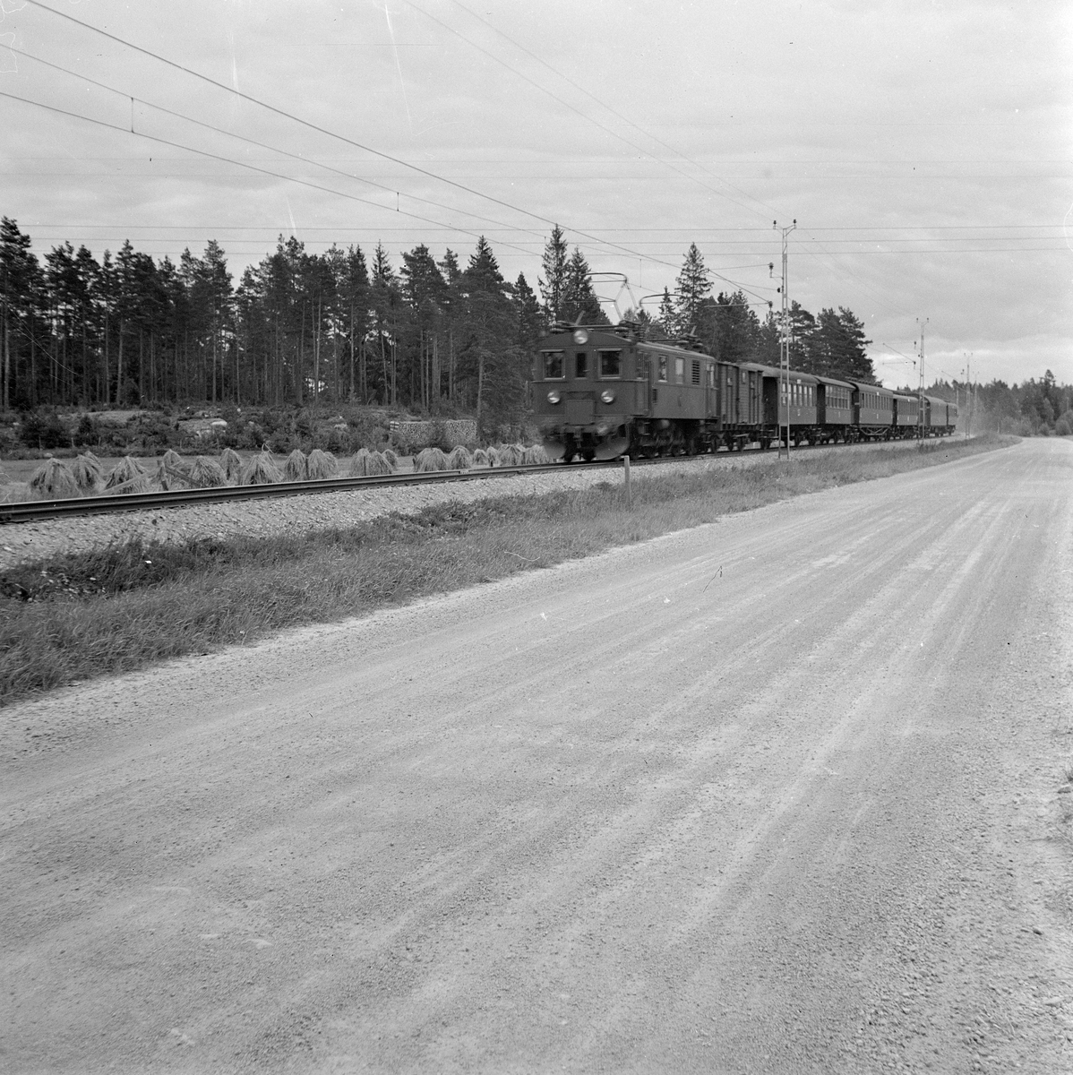 Statens Järnvägar, SJ D lok. Resandetåg norr om Sala. De första D-loken hade träkorg, medan de senare fick nitad stålkorg. D-loken var de första stålkorgsloken.