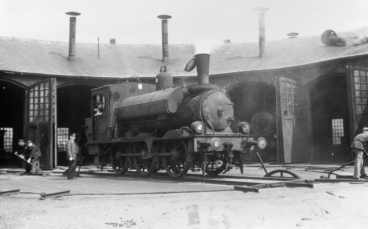 Lokstall vid Trellelborg övre. Tanklok axelföljd C vänds på vändskivan. Tre män vrider skivan. Lokstall och kolgivning användes även av Trelleborg - Rydsgårds Järnväg, TRJ. Godstrafiken fanns kvar fram till 1980-talet. Spåret revs 1984.