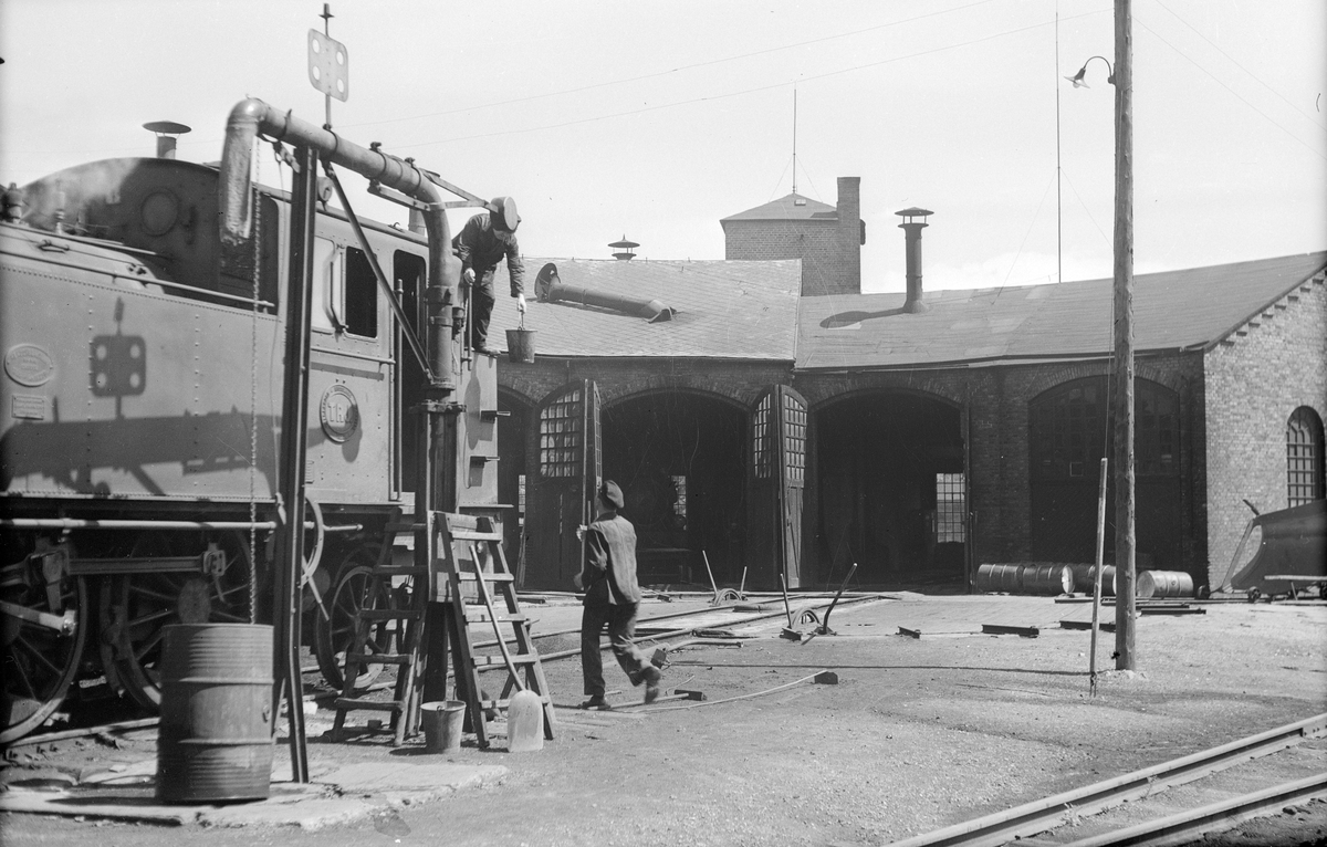 Lokstallet Trelleborg Övre. Vattenhäst med skivsignal. Lokstall och kolgivning användes även av Trelleborg - Rydsgårds Järnväg, TRJ. Godstrafiken fanns kvar fram till 1980-talet. Spåret revs 1984.