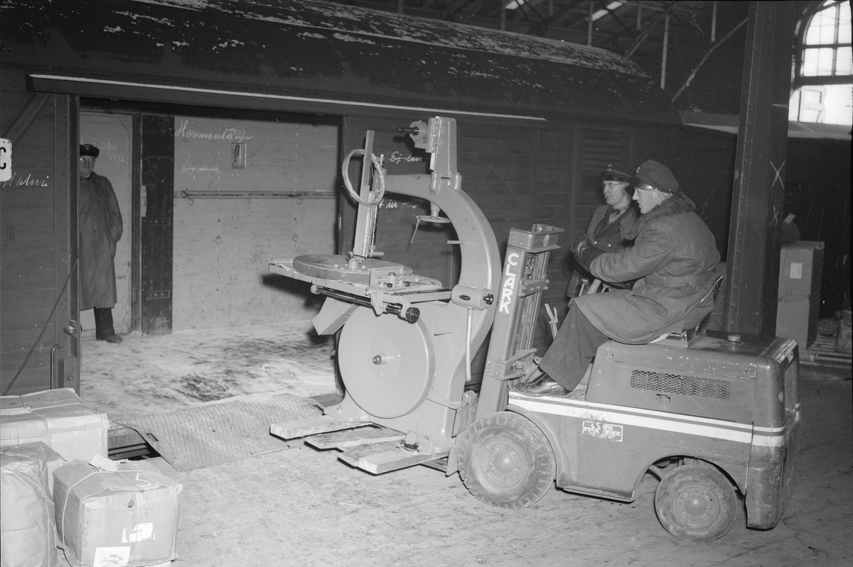 Fraktstyckegods i Malmö. Verktygsmaskin på lastpall körs med gaffeltruck. Sluten godsvagn.