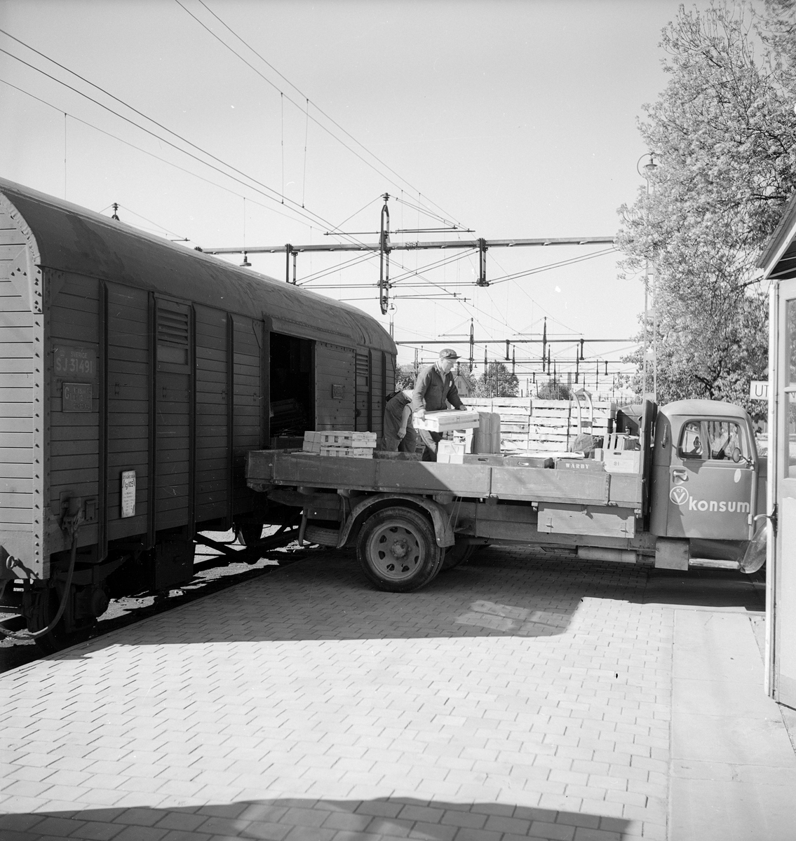 Statens Järnvägar, SJ G 31491. Omlastning av grönsaker mellan KONSUM lastbil och godsvagn.