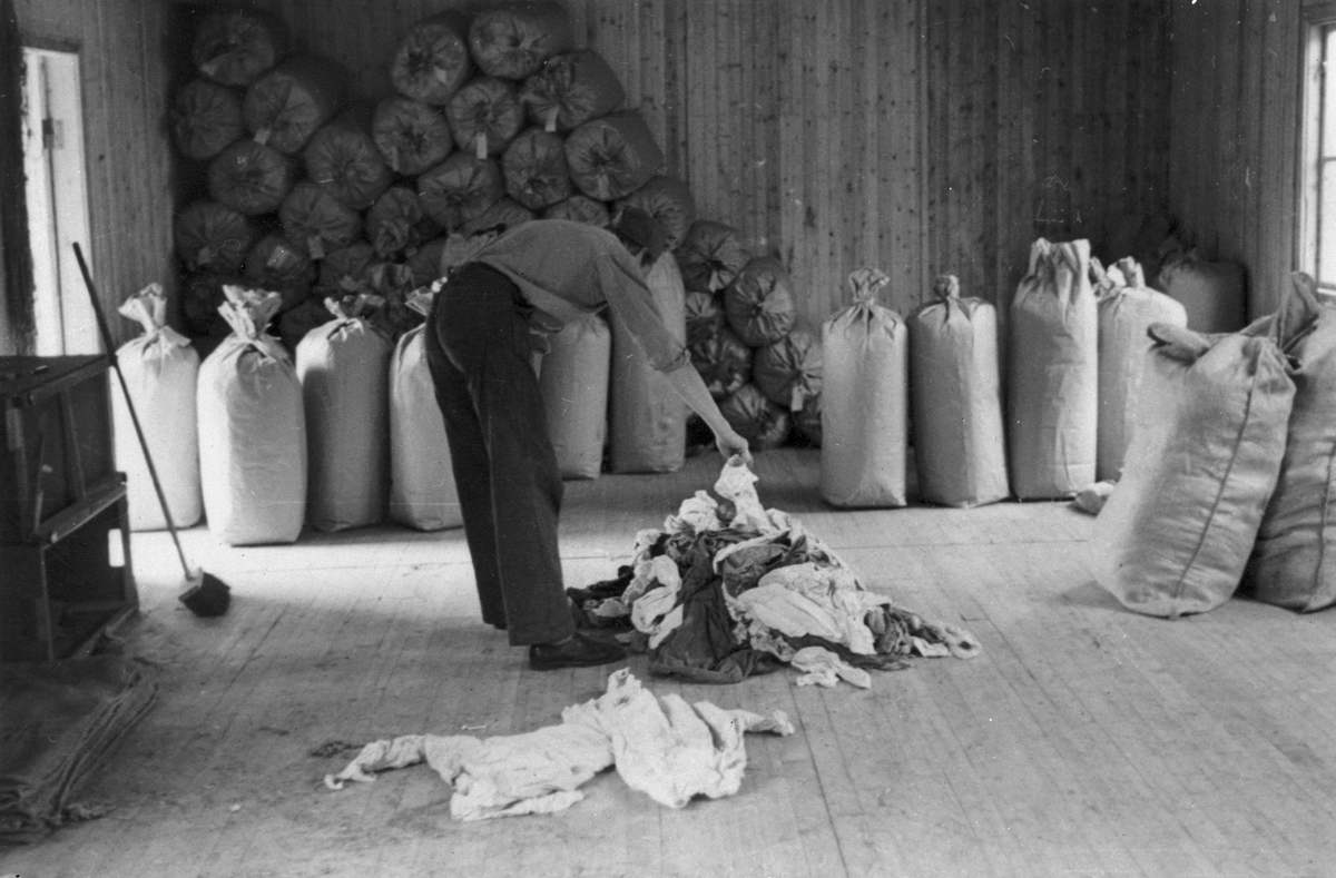 Arméns mobila tvätteri. Installerat i järnvägsvagnar. Sortering av nyss inkommen tvätt.