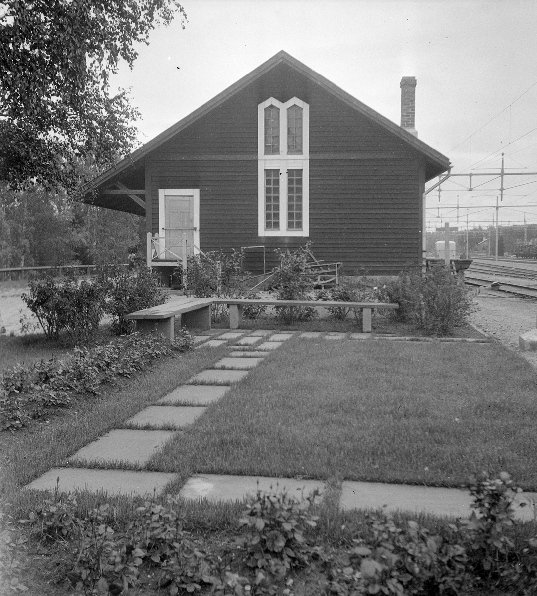 Uteplats i anslutning till Hällnäs station med godsmagasinets norra kortvägg som kuliss.