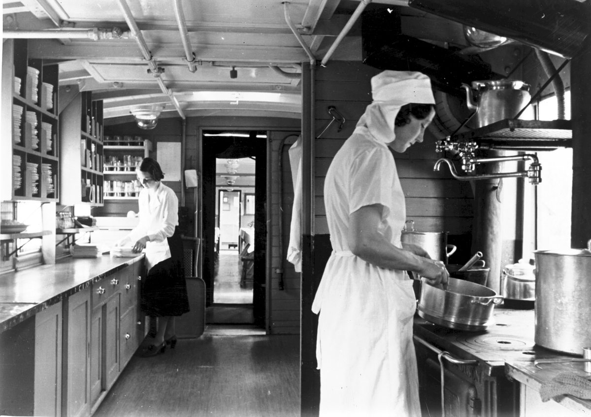 Statens Järnvägar, SJ tåghem. Personalen arbetar i köket.
