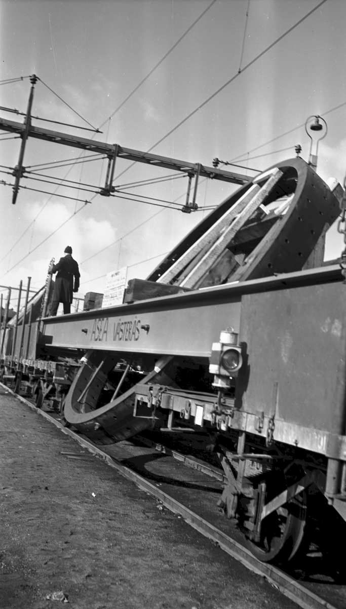 Titel: O-vagn. Diarienummer: GBR G 694. Transport av generatorringar. Järnväg i ofredstid.