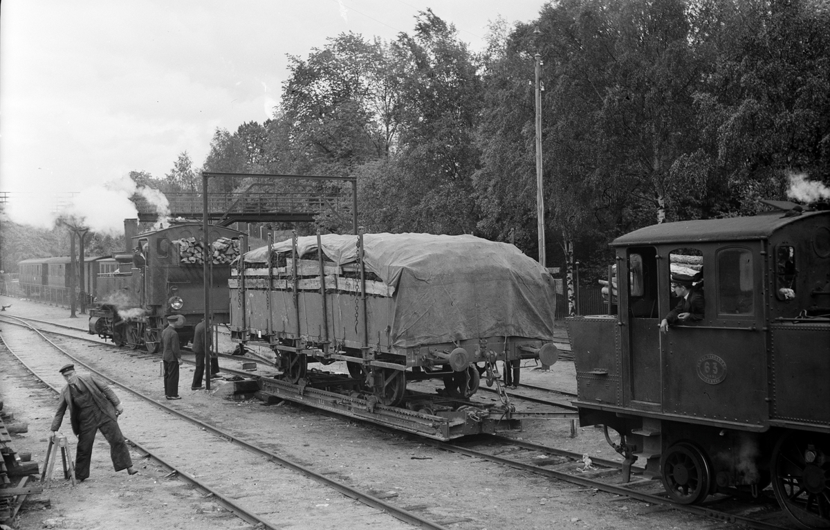 Vagnslastutbyte mellan två spårvidder 1067 till 1435. VTJ lok nummer 63 har just kommit till överföringsrampen med en överföringsvagn lastad med en torvlastad normalspårig O-vagn. CWJ lok nummer 1 är på väg att backa emot den torvlastade vagnen för att sedan dra den över på normalspåret för vidare transport.