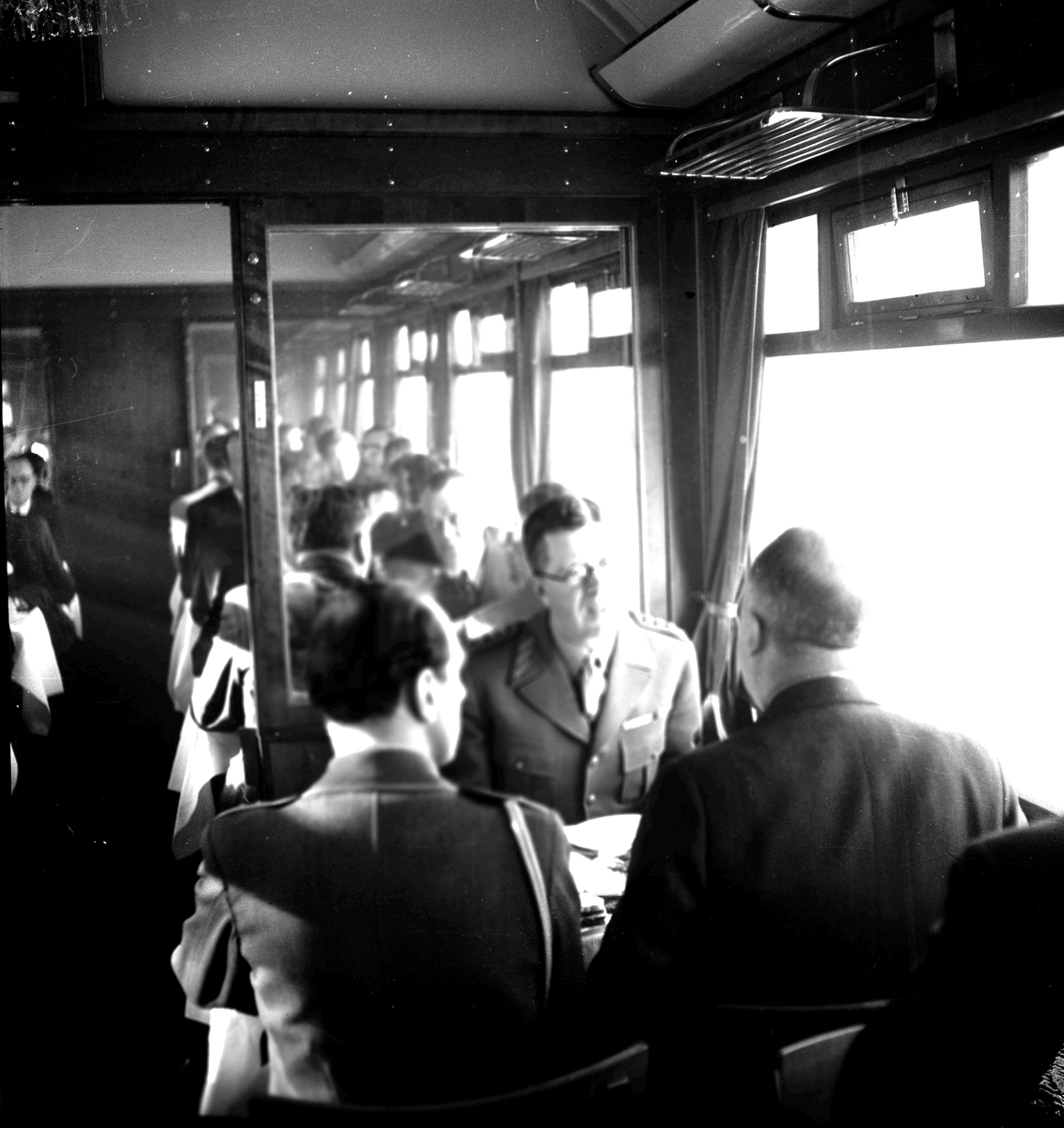 Invigning av järnvägselektrifiering sträckan Långsele - Boden. Första eltåget mellan Stockholm C - Boden C. I restaurangvagnen Kronprinsen, Överstelöjtnant av Sillén, Generaldirektör Dahlbeck.