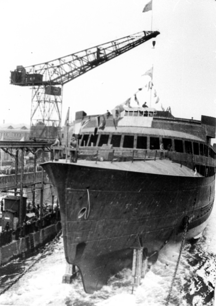 Aktuellt. Från sjösättning Malmöhus. Det nybyggda fartyget glider ner i sitt rätta element