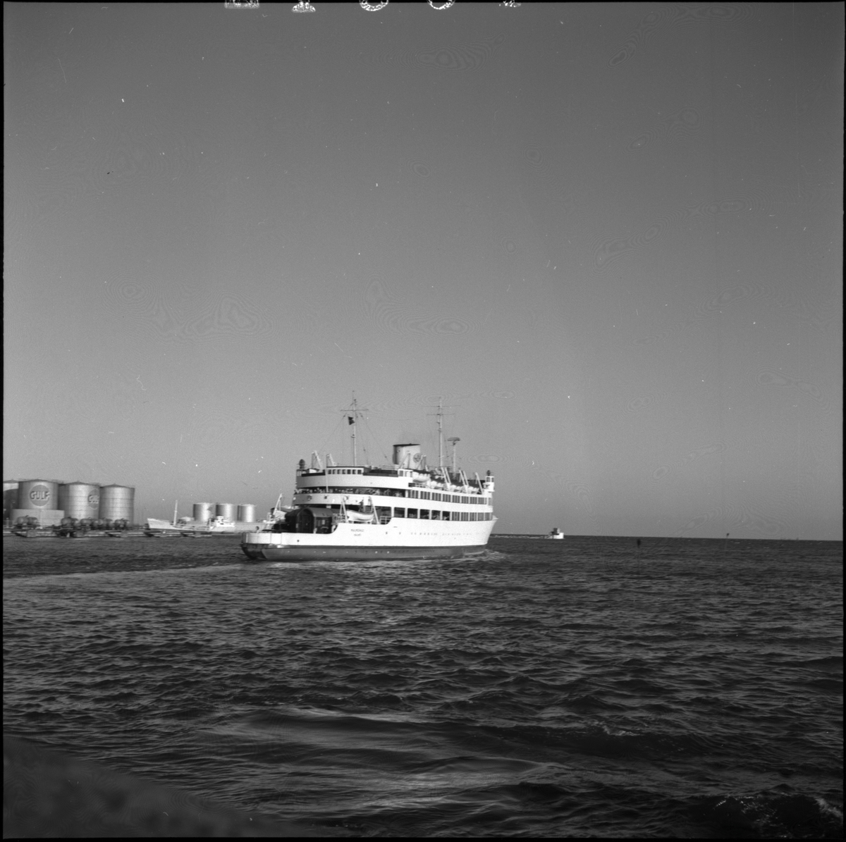 Tågfärjan Malmöhus lägger ut från hamnen. Oljecistern med texten Gulf i bakgrunden. Färjan Malmöhus byggdes 1945 av Kockums Mekaniska Verkstads AB i Malmö och ägdes av SJ Färjetrafik i Malmö. Malmöhus gick som passagerar och tågfärja mellan Malmö och Köpenhamn fram till 1974.