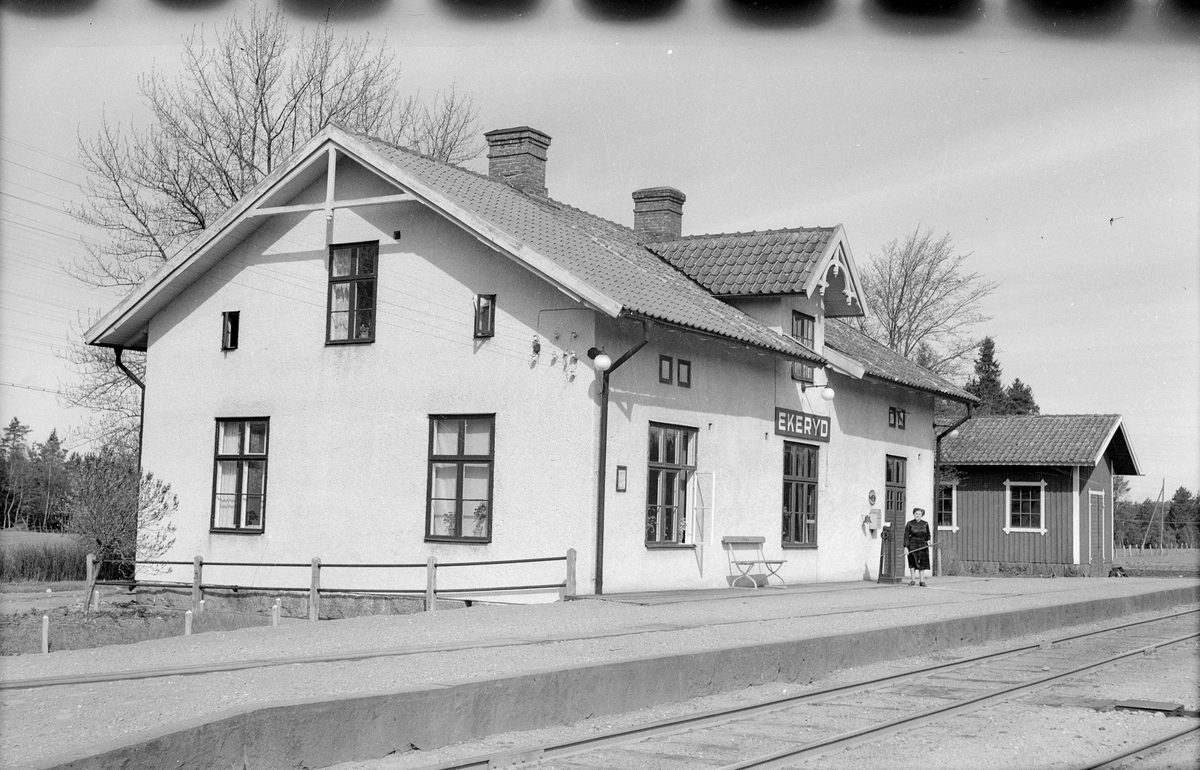 Ekeryd station. Från början var det en hållplats. Trafikplatsen öppnades 1894. Fullständig station sedan 1925. En och en halvvåningsputsat stationshus. På bilden syns en kvinnlig platsvakt.