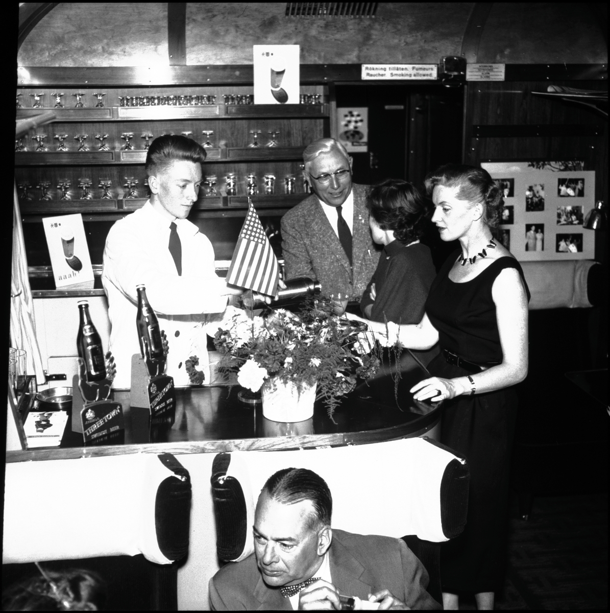 Interiör barvagnen, Swedish Night Light Cruising, SNLC. "Dollartåget" uppkom som ett försök att minska efterkrigstidens valutabrist, man riktade sig i första hand till köpstarka amerikanska turister, därav det myntade namnet