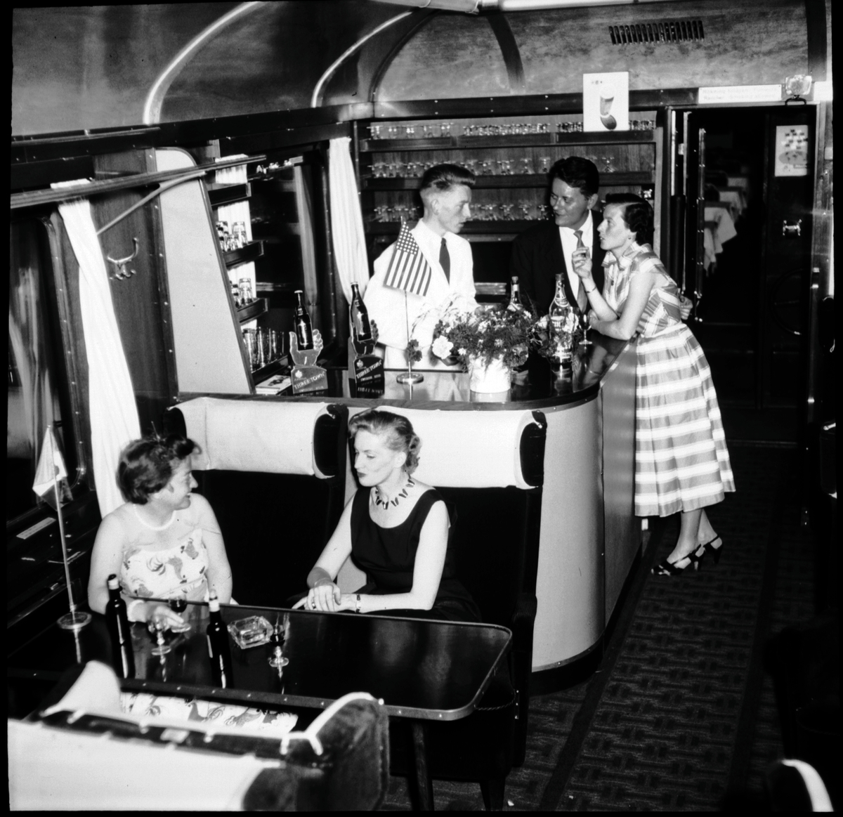 Interiör barvagnen, Swedish Night Light Cruising, SNLC. "Dollartåget" uppkom som ett försök att minska efterkrigstidens valutabrist, man riktade sig i första hand till köpstarka amerikanska turister, därav det myntade namnet