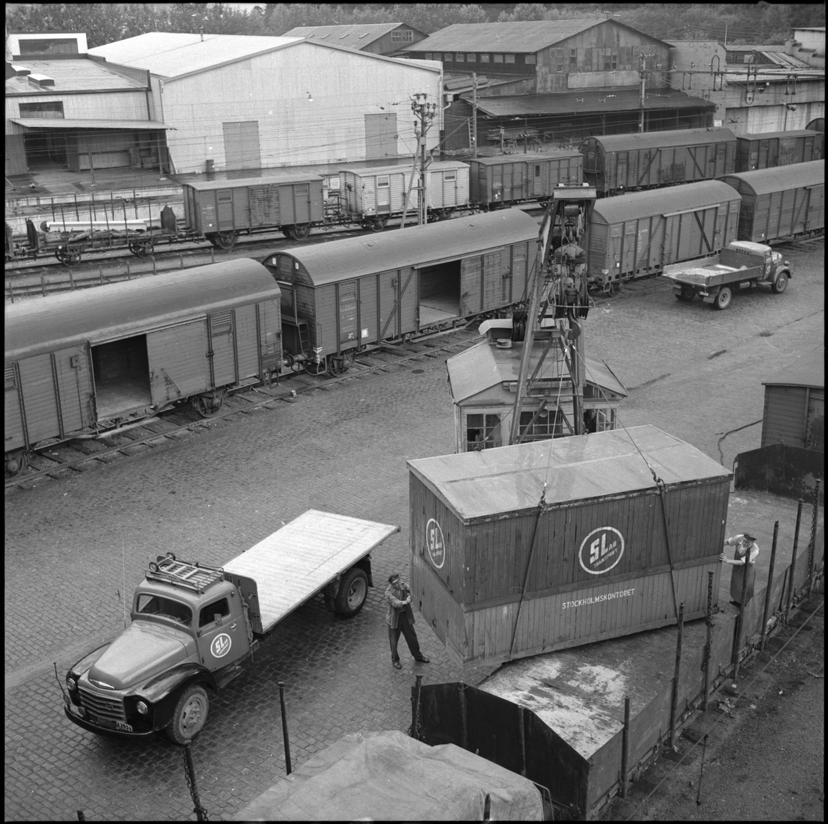 Ålderdomlig lyftkran lyfter SLAB flyttlåda, så kallad Lift.