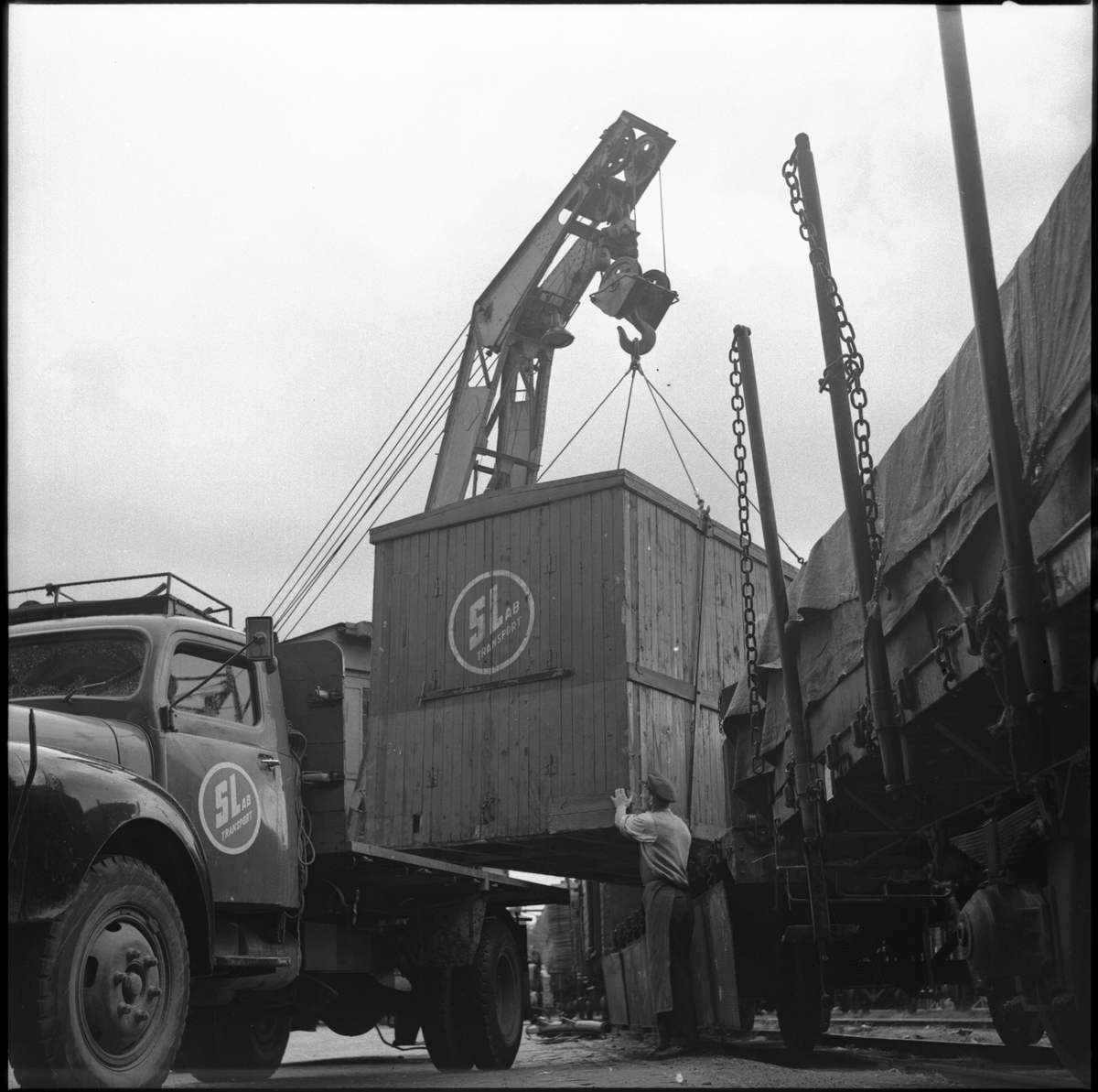 Ålderdomlig lyftkran lyfter SLAB flyttlåda, så kallad Lift.