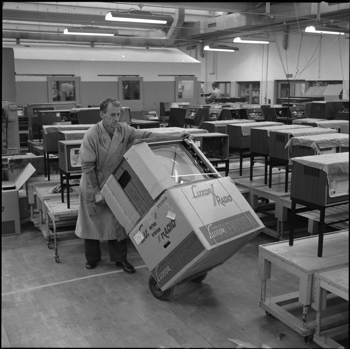 Tillverkningslokal. Tillverkningslokal. Radio och TV - apparater. Låda med texten Aktas för stötar, Luxor Radio, Luxor Television.