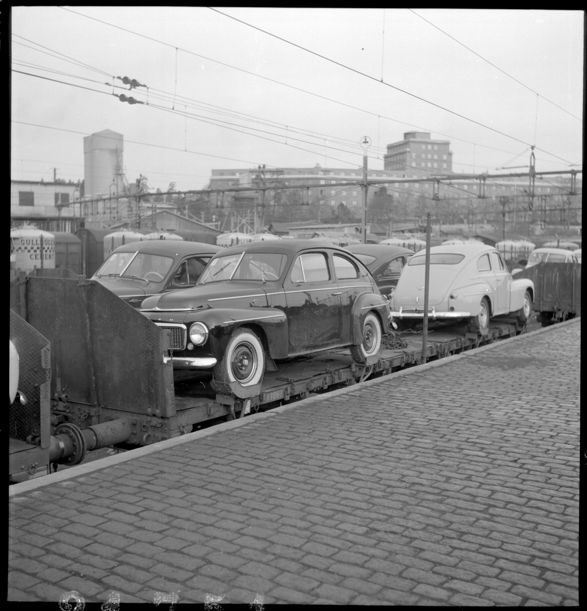 Statens Järnvägar, SJ O 77063. O-vagn lastad med Volvobilar, dubbla rader.