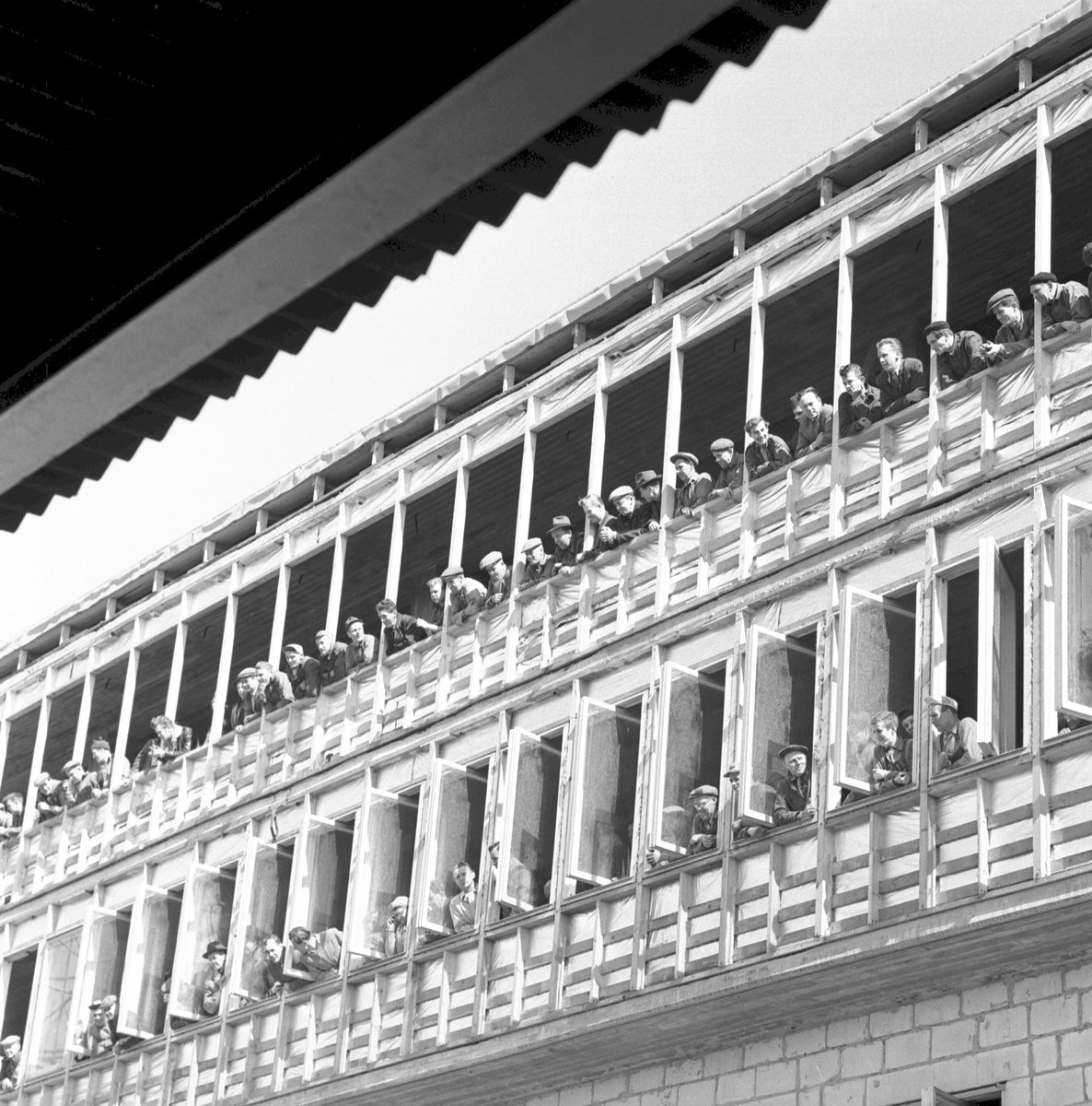 Vid Norges Kung Olav V,s besök i Stockholm. Intresserade ur arbetsstyrkan vid nybygget vid centralsttionen.