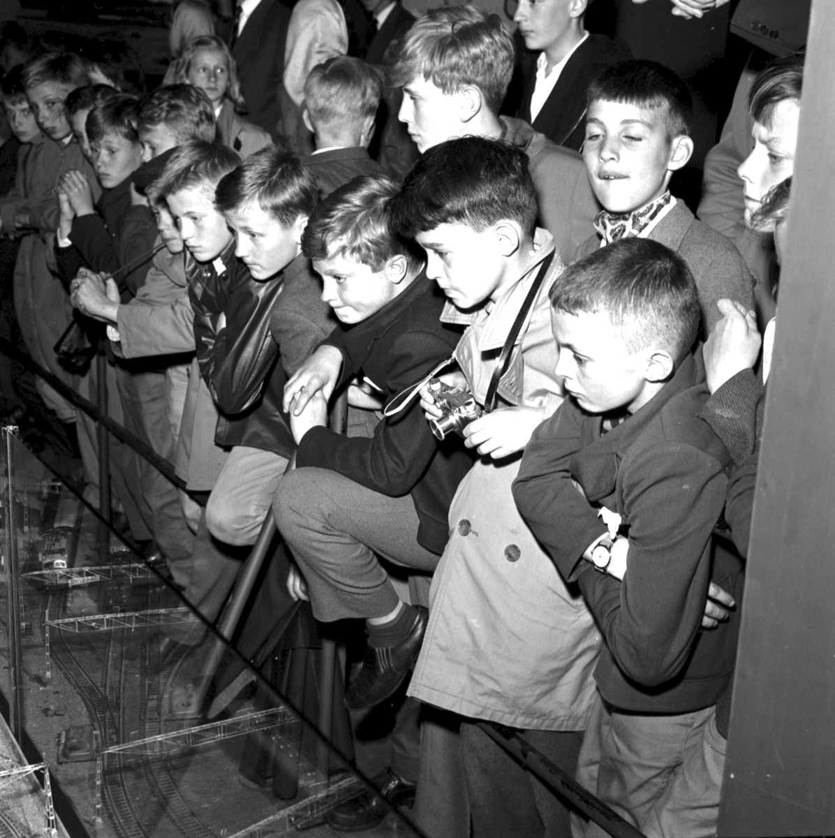Statens Järnvägars, SJ, modelljärnväg. Kronprinsen med skolkamrater från Broms skola besöker modelljärnvägsutställnigen, på Gröna Lund.