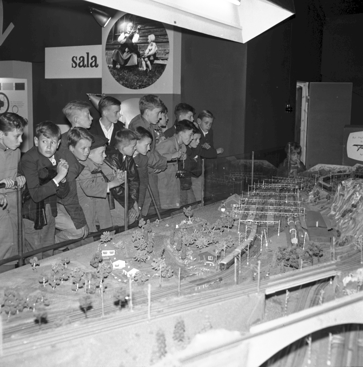 Titel: Statens Järnvägars, SJ, modelljärnväg. Kronprinsen med skolkamrater från Broms skola besöker modelljärnvägsutställnigen, på Gröna Lund.